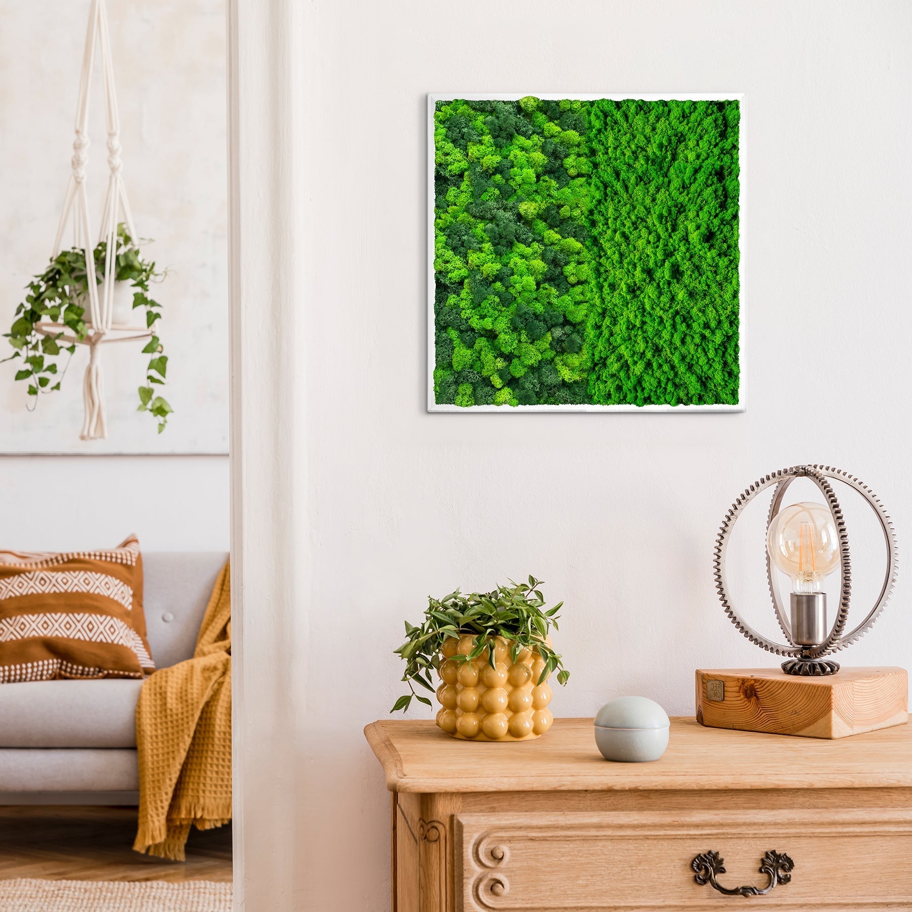 Introducing Articture's Half Moss Art Square Frame! It is made up of preserved reindeer moss and decorated uniquely for added for extra pop and to create a stunning design.
